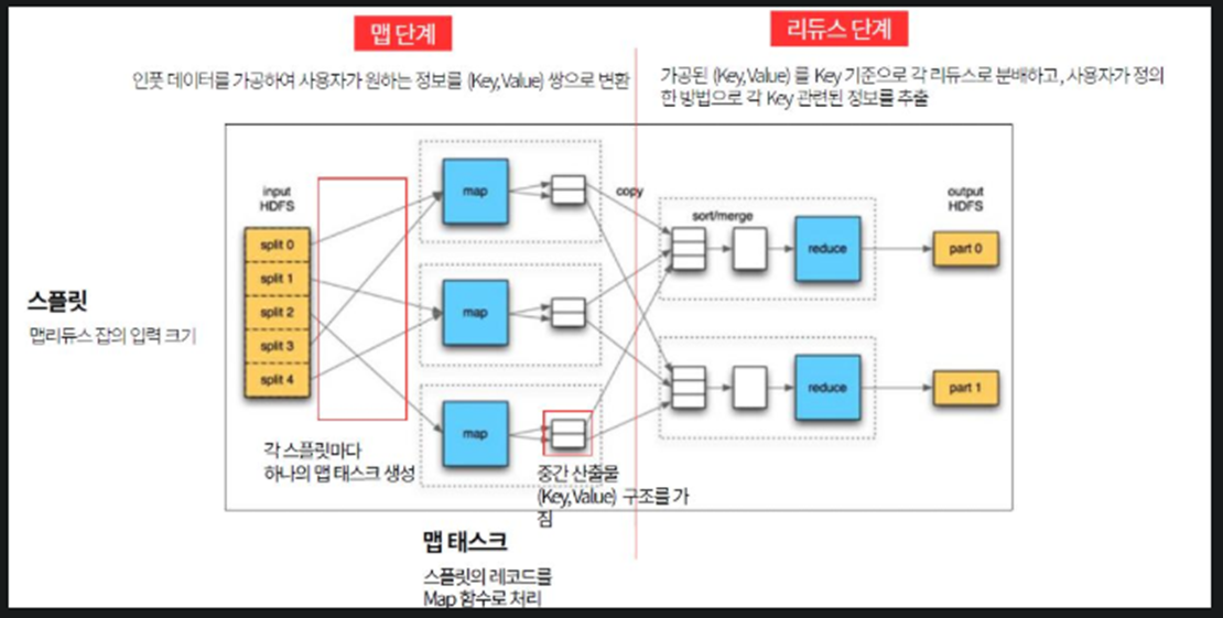 MapReduce의 연산은 크게 map, shuffle, reduce 이렇게 3단계로 나눠서 처리합니다. 위에서 보시는 바와 같이 Map 단계에서는 HDFS에서 읽은 데이터가 다수의 독립적인 Map Task로 나뉘어서 '병렬로 처리' 됩니다. 이상적으로 HDFS Block 하나당 하나의 Map Task가 배정되는 것이 이상적입니다.