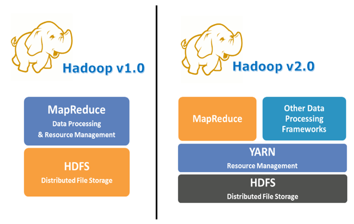 보사는 바와 같이 Hadoop 1.x 에서 보이지 않던 Yarn Framework가 Hadoop 2.x에서 생겨난 것을 확인할 수 있습니다. Hadoop 2.x 에서는 Yarn을 추가해서 '자원관리 및 작업 스케줄링'에 대한 책임을 Yarn에게 인수하면서 MapReduce가 경량화 되었고, MapReduce 이외의 작업을 Hadoop이 처리할 수 있게 되면서 기존 구성도에서 가지고 있던 문제점을 해결할 수 있게 되었습니다.