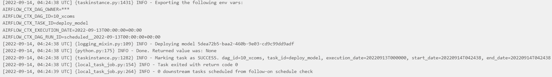 train_model, deploy_model 간 ID를 공유하기 위해 함수 내에서 xcom_push 및 xcom_pull을 명시적으로 사용 하여 모델 ID 값을 전송 및 반환해야 합니다.