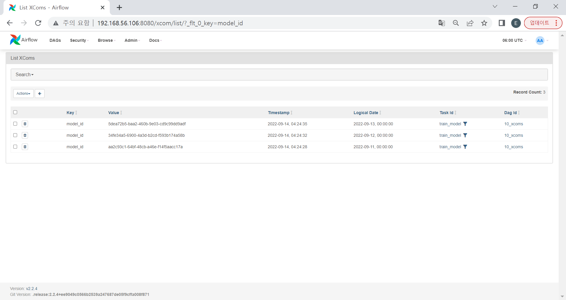 - train_model Task는 다른 Task에서 XCom 값을 사용할 수 있도록 XCom에 모델 식별자 값을 보냅니다.