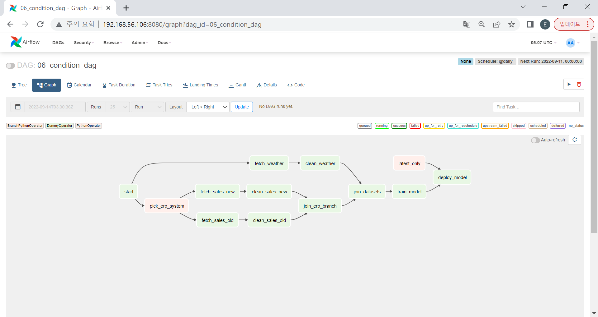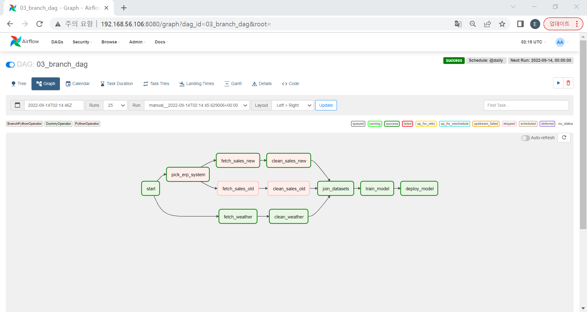 다음과 같이 두 개의 개별 Task 세트 즉 판매 데이터 old, new를 개발하고 DAG가 이전 또는 새로운 ERP 시스템에서 데이터 수집 작업 실행을 선택할 수 있도록 하는 것입니다.