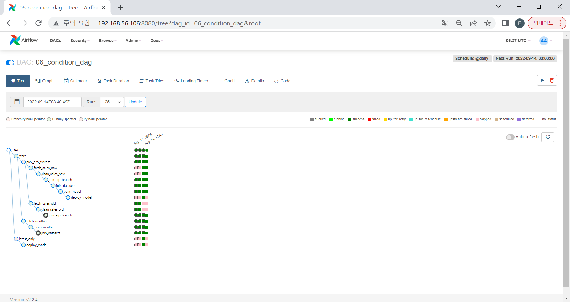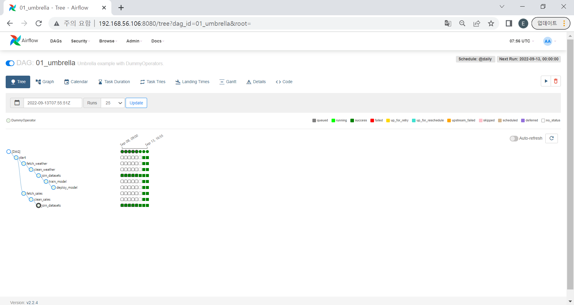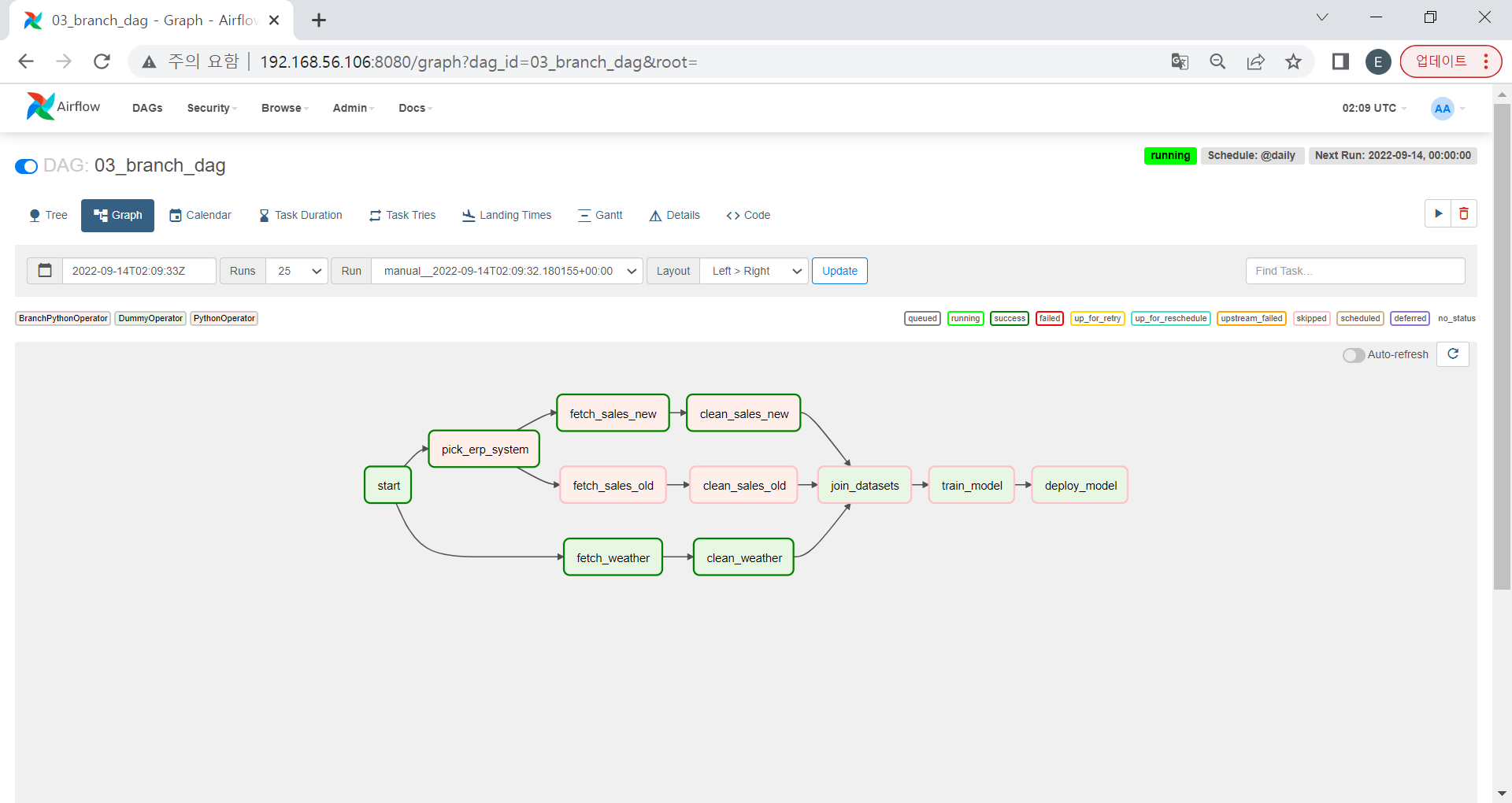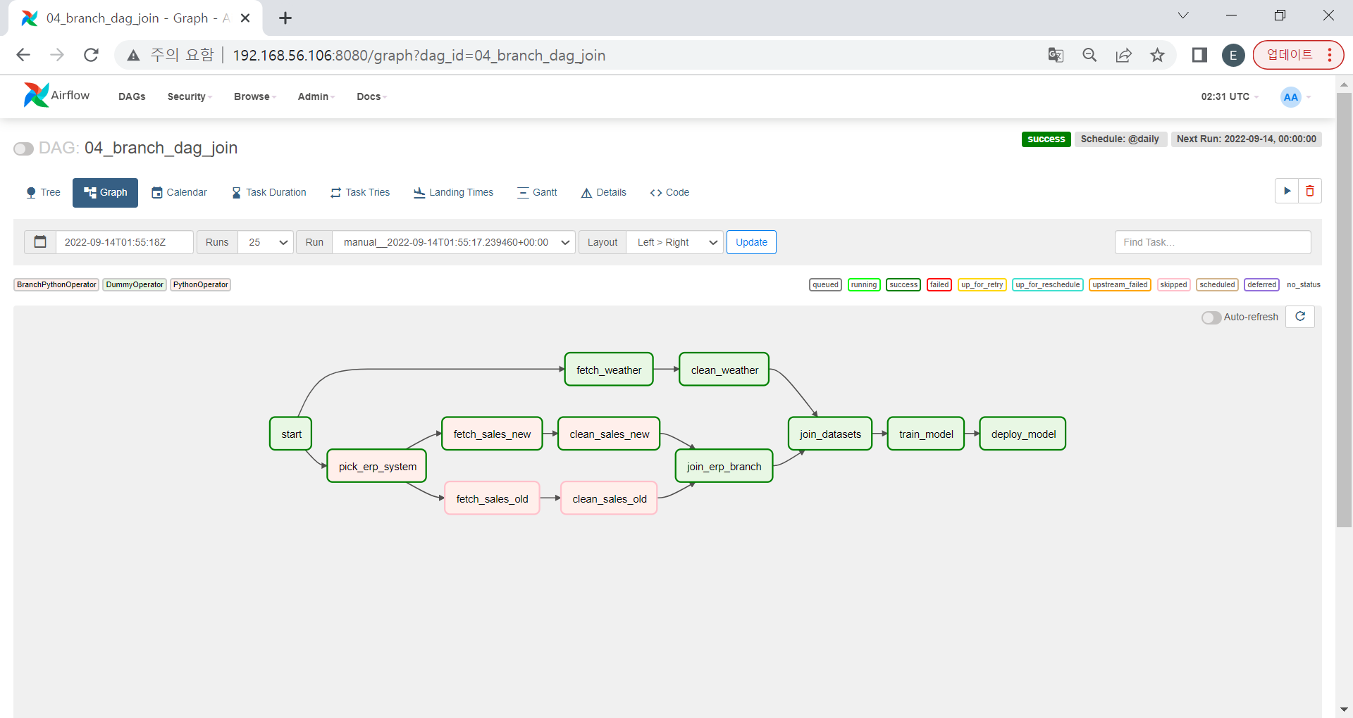 위에서 보시는 바와 같이 fetch_weather (날씨 데이터 가져오기), clean_weather (날씨 데이터 정제하기) Task는 서로 선형 의존성을 가지고 있지만 fetch_sales (판매 데이터 가져오기), clean_sales (판매 데이터 정제하기) Task와는 서로 의존성을 가지고 있지 않습니다.