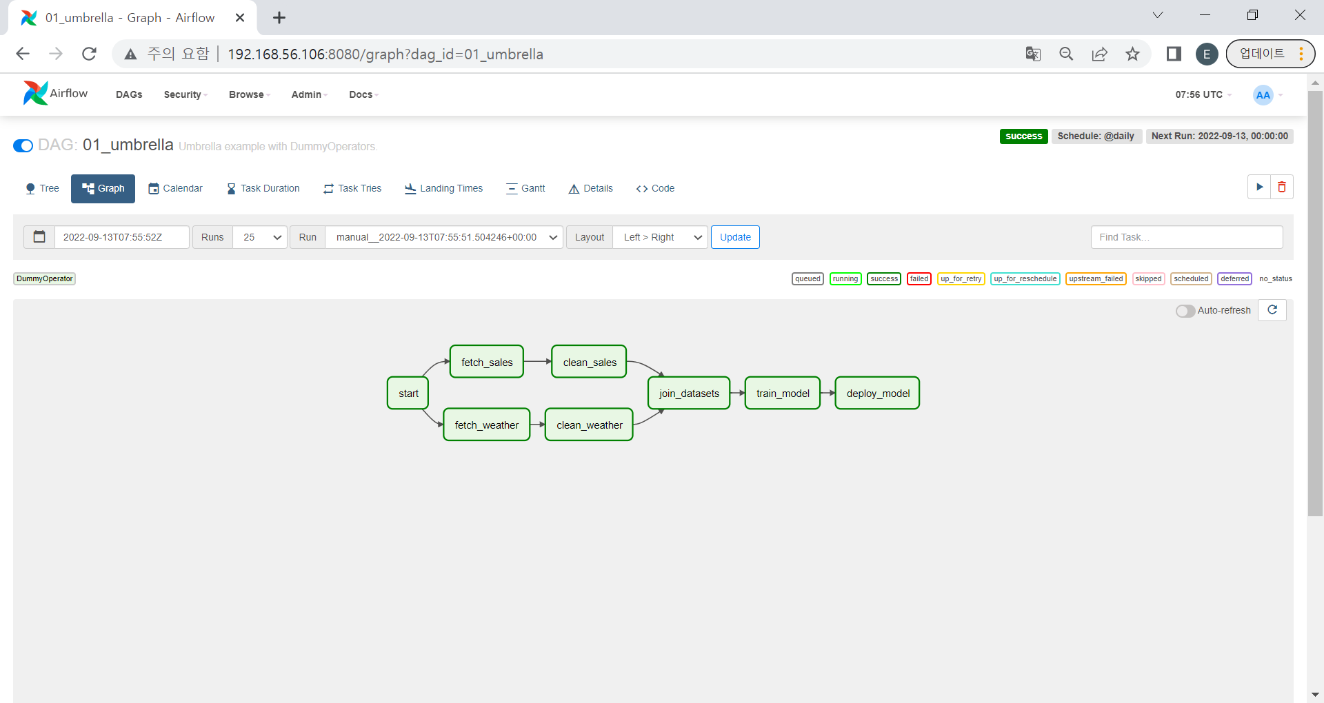 보시는 바와 같이 DAG를 실행하면 Airflow가 먼저 start Task를 실행시키고, 병렬로 sales, weather Task가 실행 됩니다. 이 후 업스트림이 Issue 없이 정상적으로 실행된다면 join_datasets Task가 실행되고, 이 후 train_model, deploy_model이 실행됩니다.