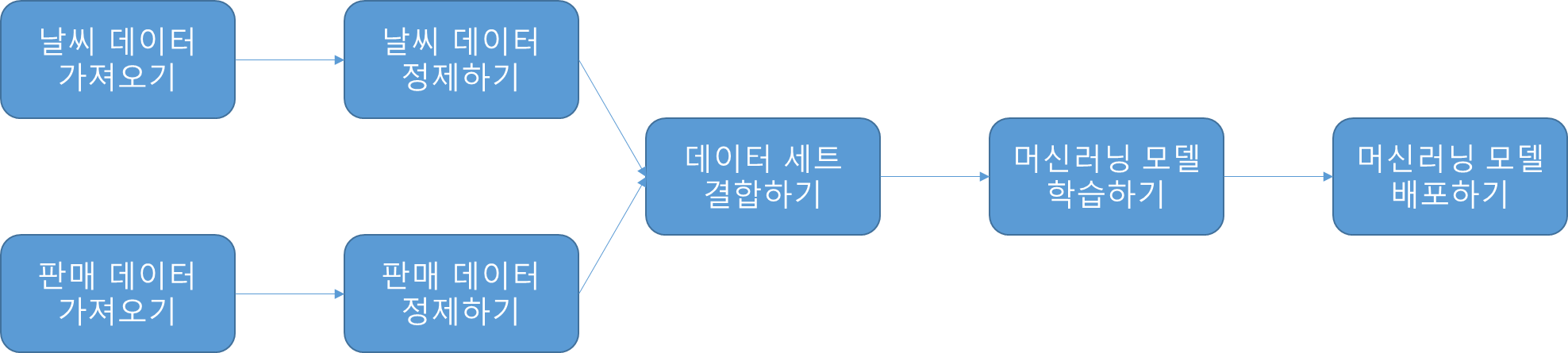 차례대로 데이터 셋 결합하기, 머신러닝 모델 학습하기, 머신러닝 모델 배포하기의 순서로 Task가 선형 의존성을 가지고 있습니다.