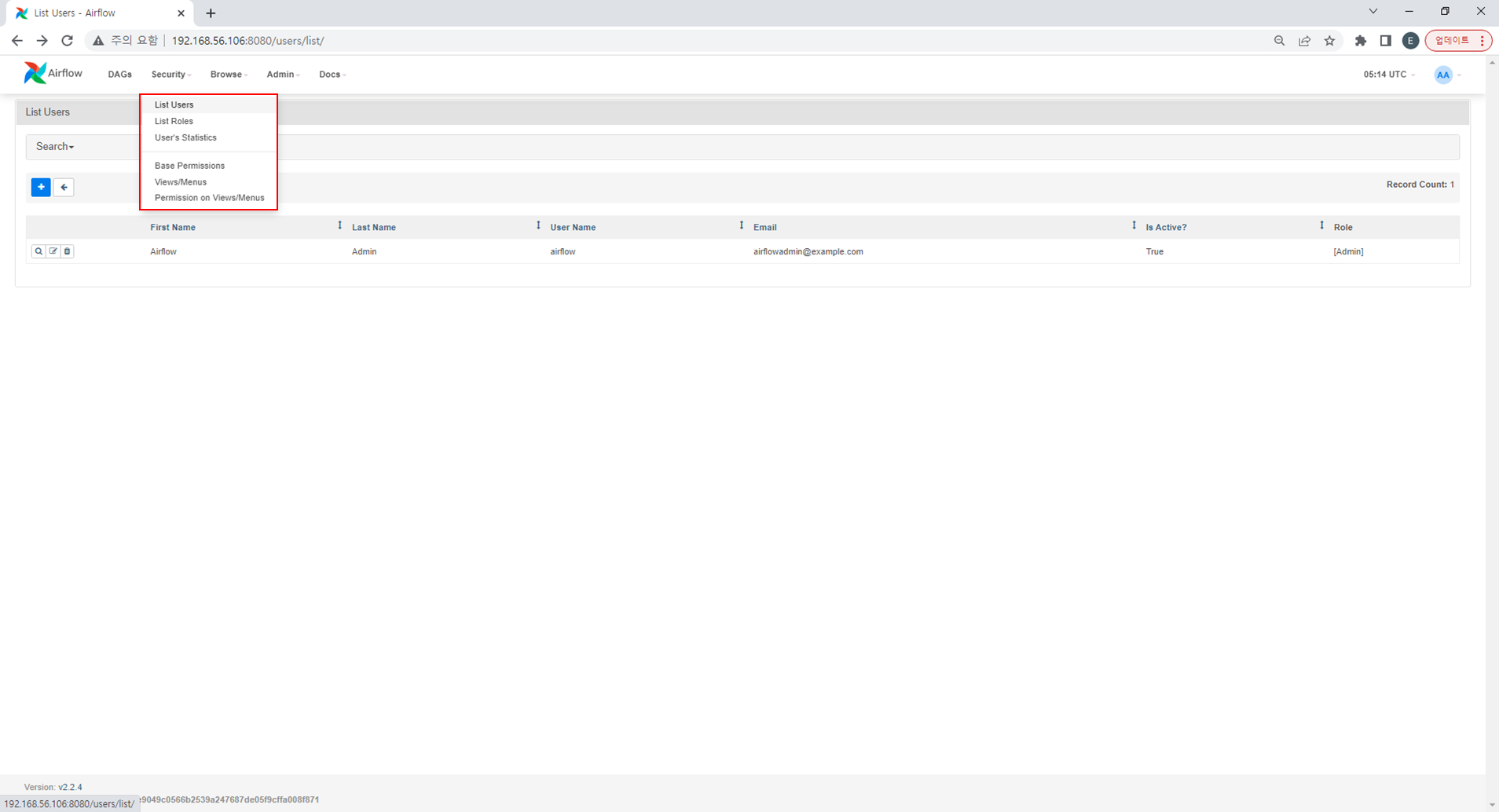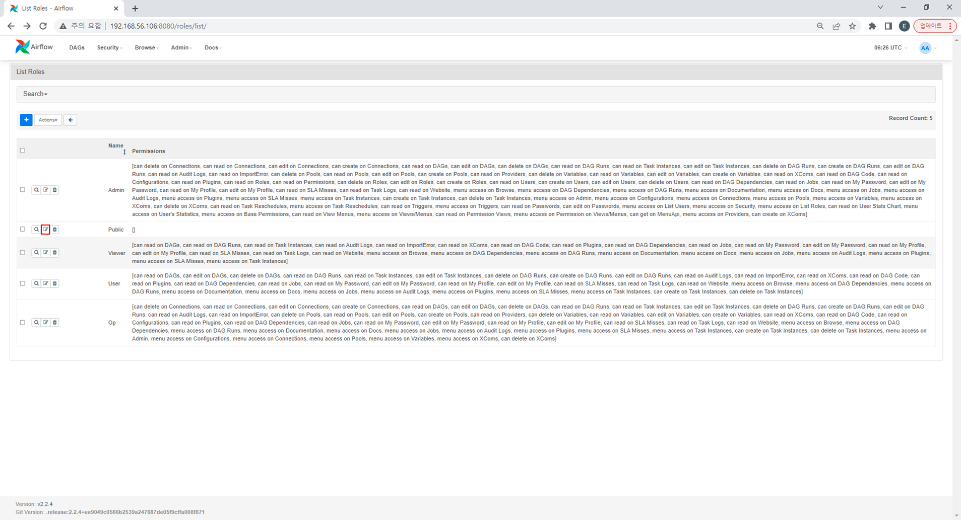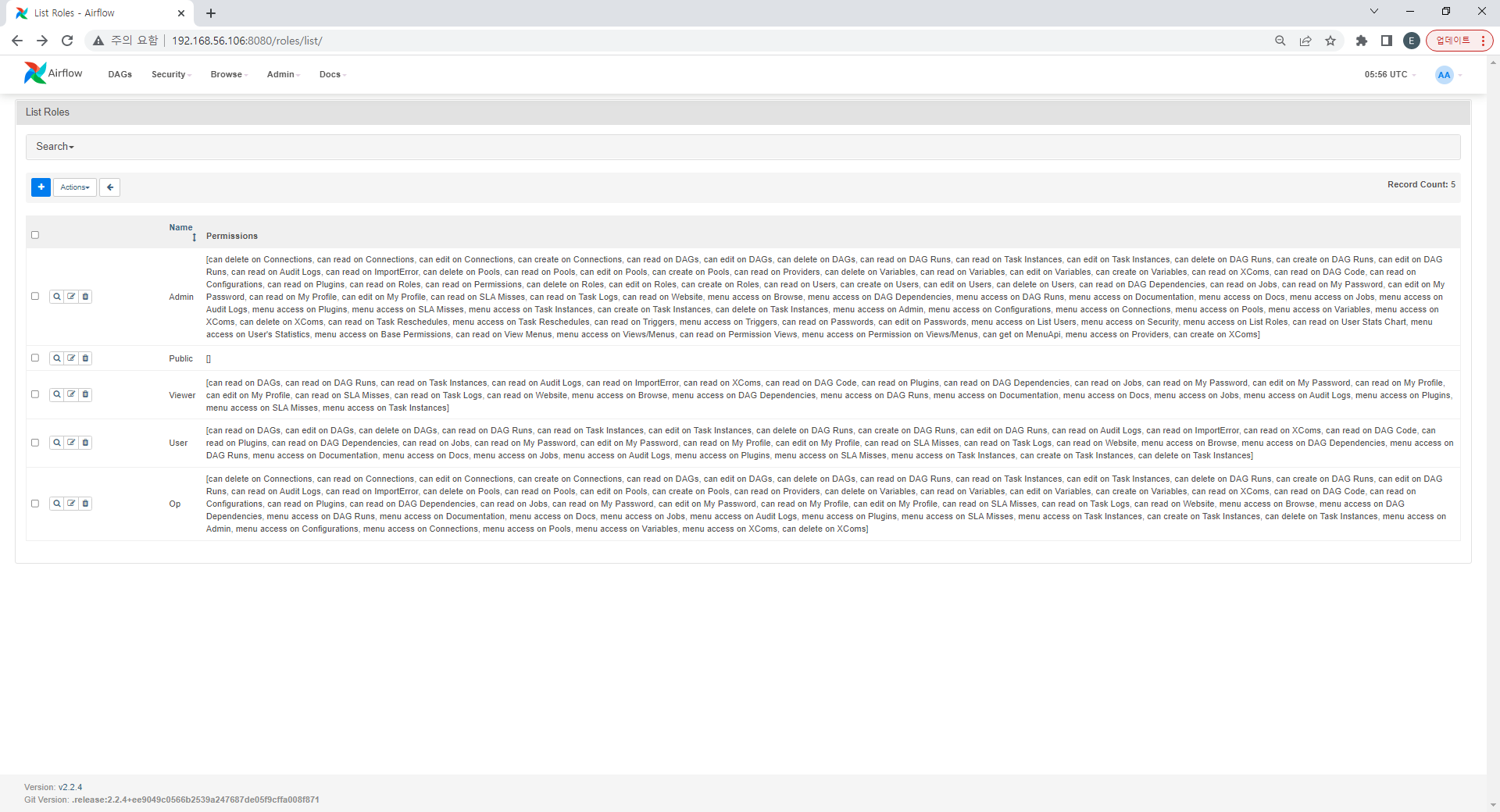 - Security의 'List Roles'를 확인해 보면, Airflow의 기본 역할 및 해당 권한을 확인할 수 있음