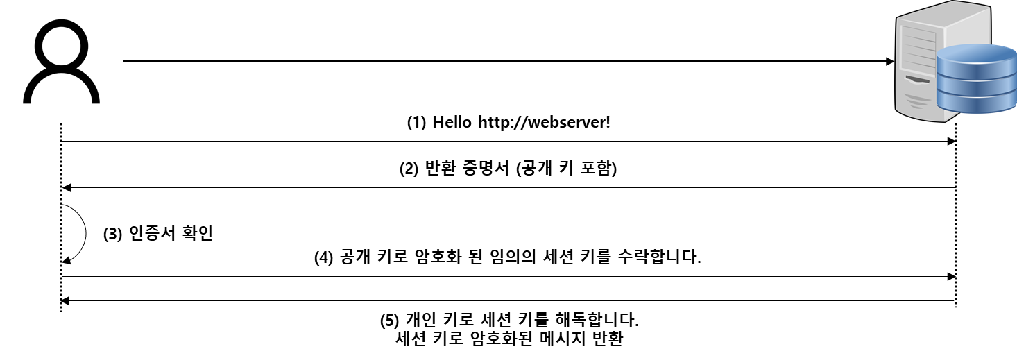 HTTPS 세션이 시작 -> 공개적으로 공유할 수 있는 키가 있는 파일의 인증서를 사용자(브라우저)에게 봔환 -> 브라우저는 임의로 생성된 세션 키를 공개 키로 암호화하여 웹 서버에 반환 -> 개인 키로만 이 메시지를 해독 및 액세스 가능