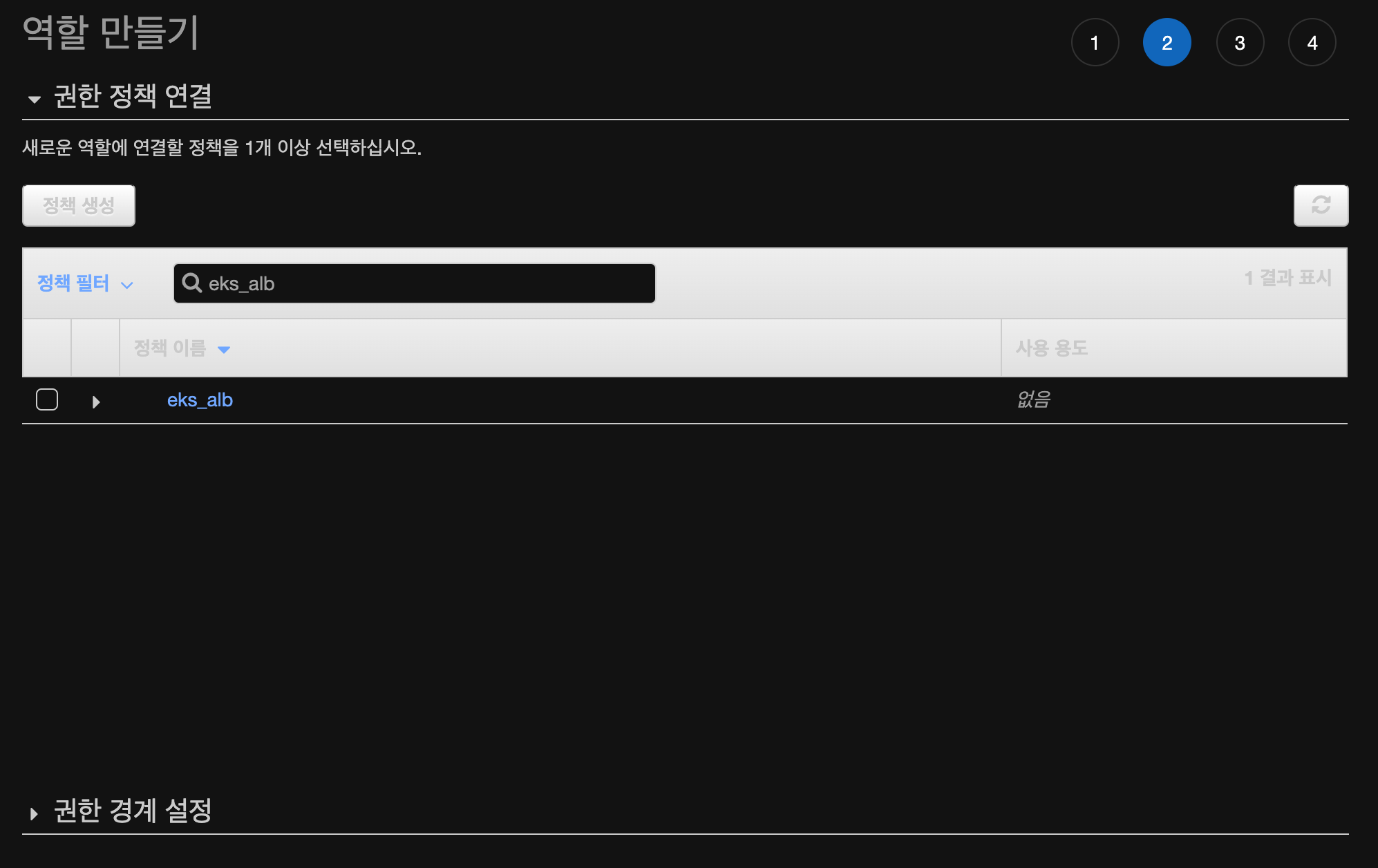 IAM 대시보드에서 '역할' -> 'eks_alb' 역할이 생성된 것을 확인할 수 있다.