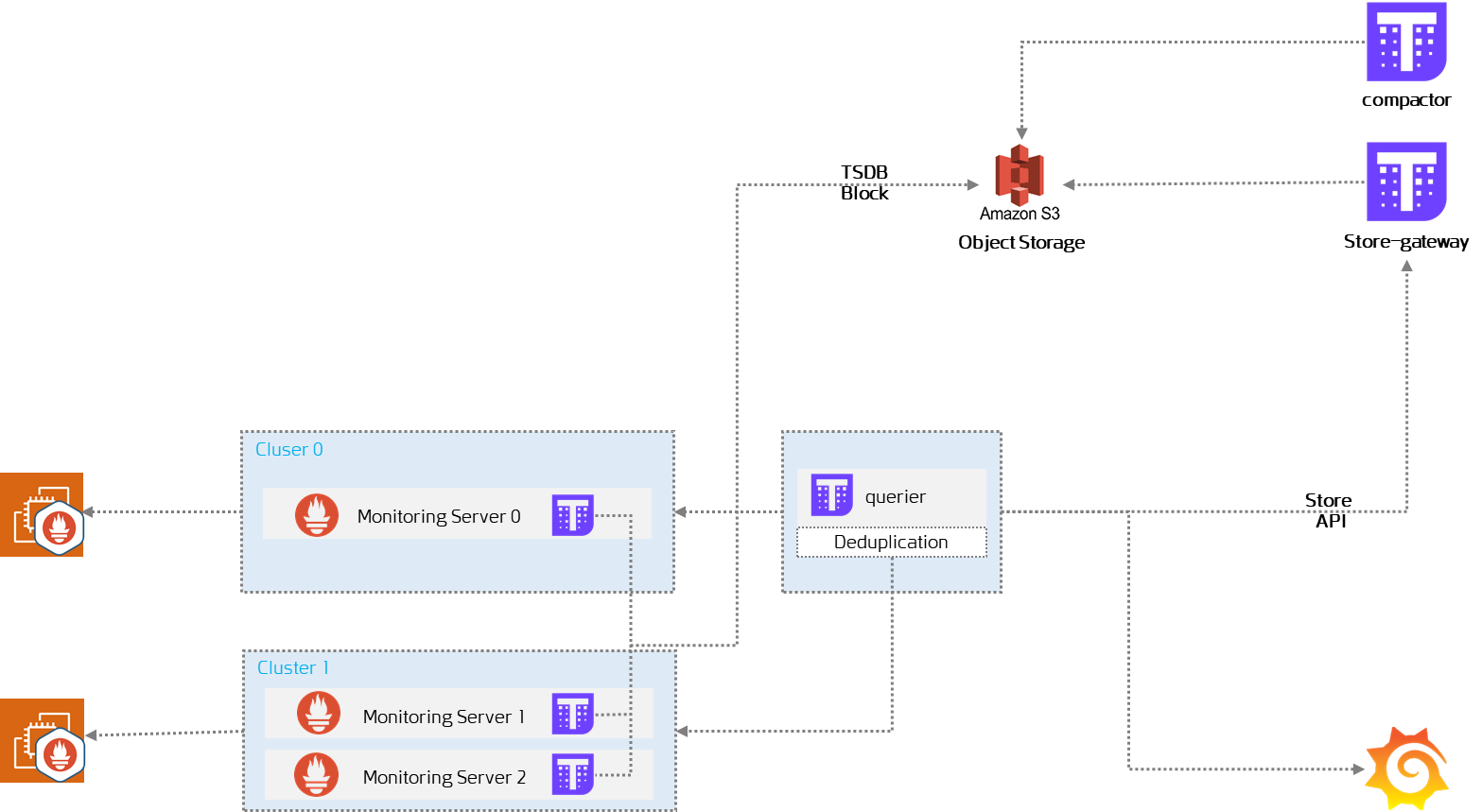 · Cloud Object Storage에 Data 수집, Compactor를 통해 Data를 압축/삭제 및 Downsampling하여 저장된 Data를 보관 및 관리 (사실상 영구적으로 Data를 저장/관리할 수 있게 됨)